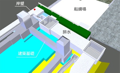 3DCADにより施工手順を可視化しました。岸壁や屋根施設、付帯構造物及び周辺施設の取付形状の確認や施工手順の妥当性について3Dで確認することができます。