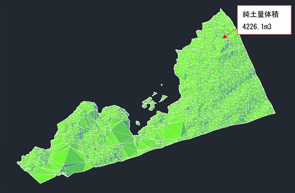 3次元点群測量データ及び3DCADを用いた泊地浚渫の土量算出例です。3次元モデルを作成することで数量算出の効率化や、形状の把握も容易になります。
